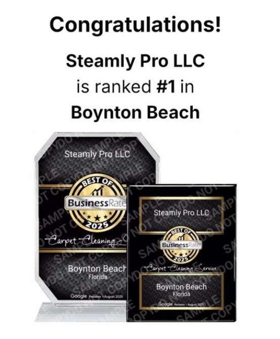 Steamly Pro LLC is proud to be ranked the #1 Carpet Cleaning Service in Boynton Beach for 2025. We don’t just clean floors; we restore them to their original glory. Our commitment to excellence has earned us a BusinessRate Score of 259/300, outperforming competitors through consistent 5-star customer reviews and unmatched service quality.